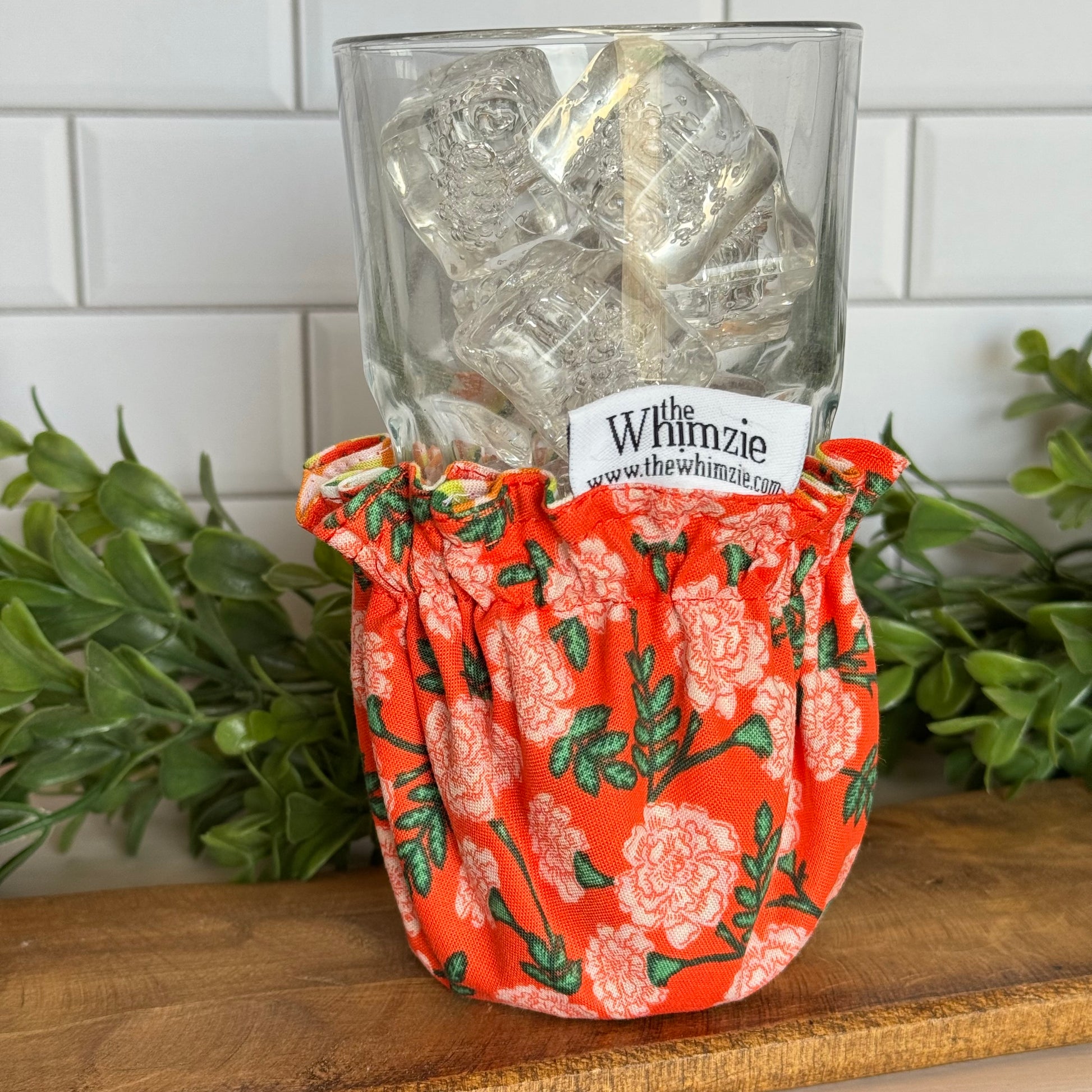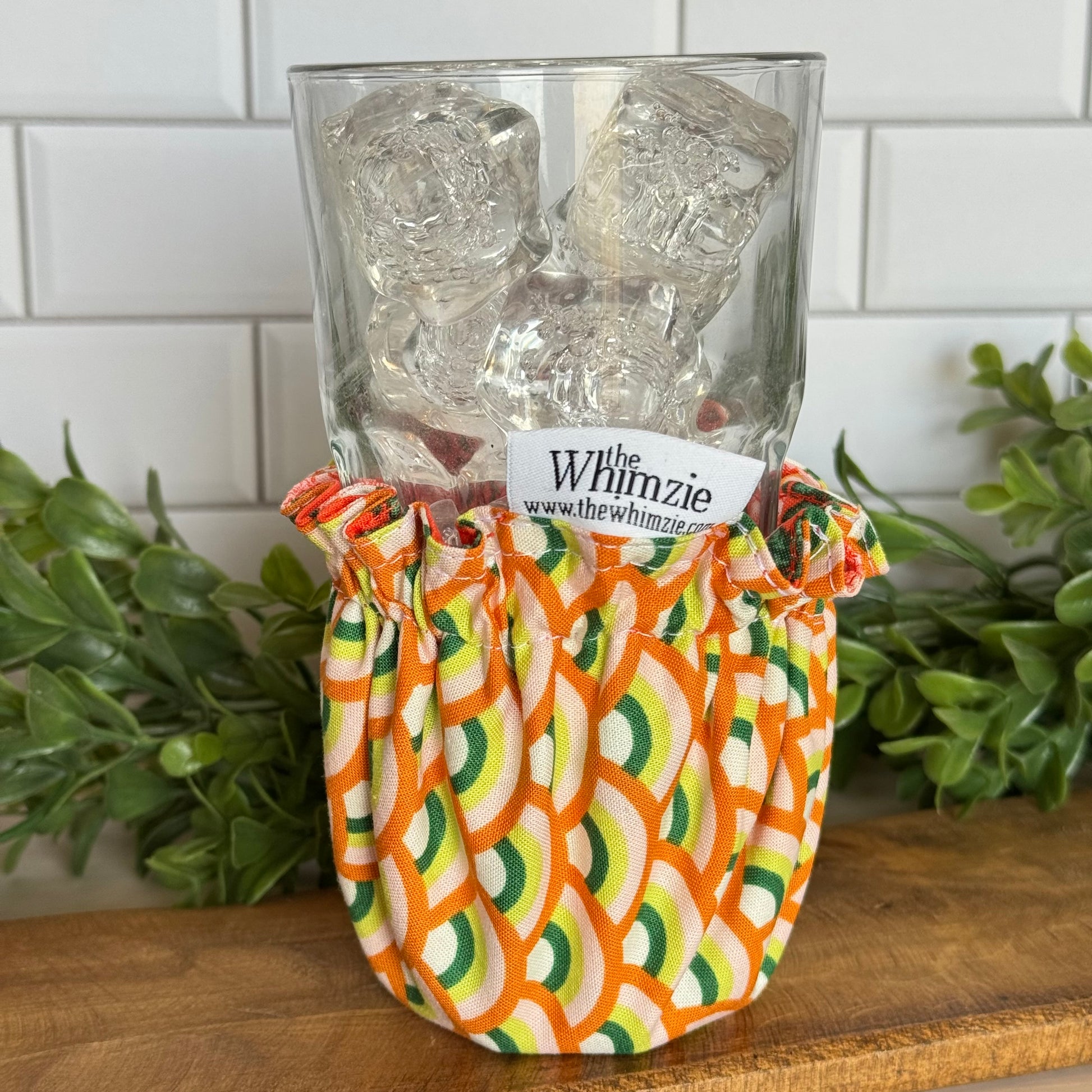 The Whimzie®, most commonly known as "a coaster on the go," slips onto your beverage of choice, saving everything from getting wet. Whimzies are: universal, distinctive, reversible, and machine washable (lay flat to dry). They are perfect for: drinking glasses, water bottles, soda cans, juice boxes of various sizes, keeping a piece of fruit clean in your handbag, holding onto little odds & ends on your nightstand, or as an ice pack for a little one