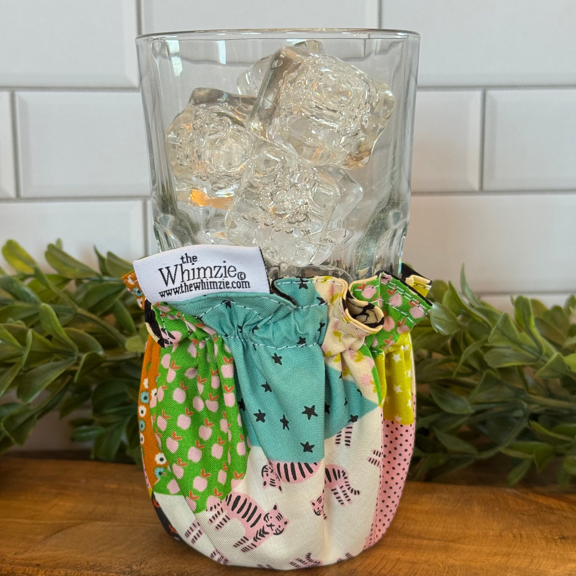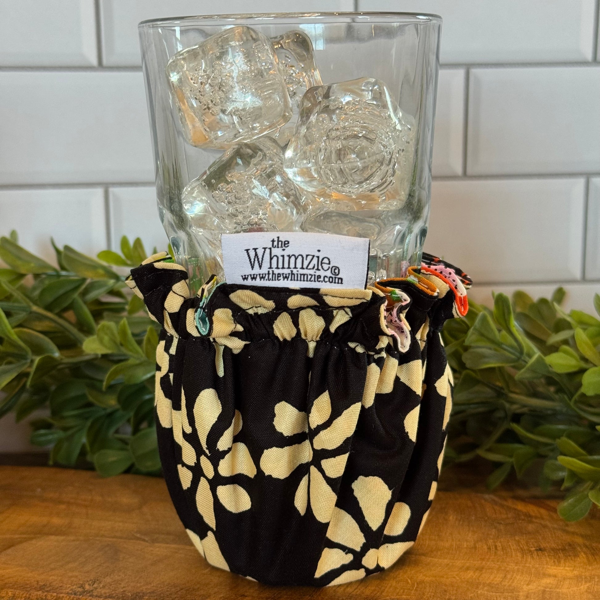 The Whimzie®, most commonly known as "a coaster on the go," slips onto your beverage of choice, saving everything from getting wet. Whimzies are: universal, distinctive, reversible, and machine washable (lay flat to dry). They are perfect for: drinking glasses, water bottles, soda cans, juice boxes of various sizes, keeping a piece of fruit clean in your handbag, holding onto little odds & ends on your nightstand, or as an ice pack for a little one